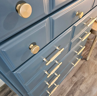 After checking that the primer did indeed adhere to the dresser, I mixed together a few colors of Benjamin Moore Advance paint to create this beautiful shade of blue. I love the new look of this piece, and I'm so glad that I persevered through all the primer issues I encountered!